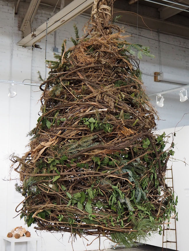 This structure is best experienced in person, sitting underneath and looking inside, where there are suspended bird feathers and sounds from a hidden speaker of birds in the forest.